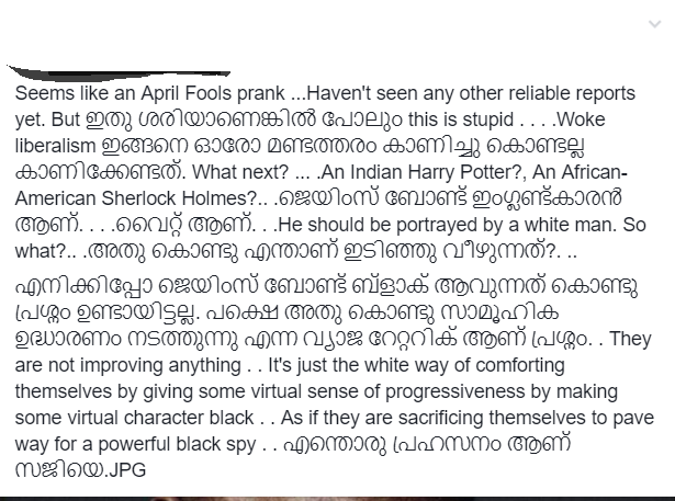 If you are a regular person who loves movies and is on the internet for a normal amount of time, you would probably have already come across the Idris Elba - James Bond controversy. Most of the discussion online has regressed to racists keyboard wars and troll baits. I came across a post in one of the popular Malayalam Facebook groups, where the post-author expresses his disagreement with Idris Elba as an option for Bond.